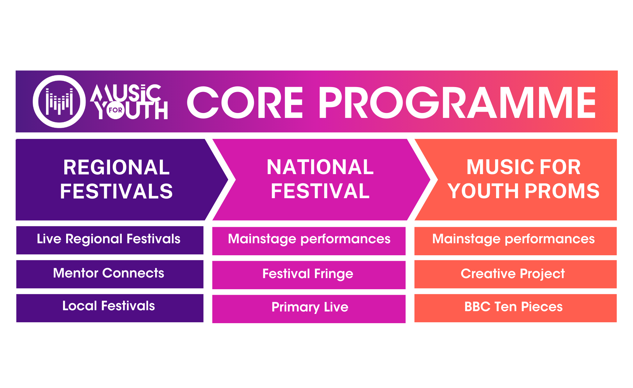The season culminates with the Music for Youth Proms in November 2026. Groups from the National Festival may be invited for a mainstage performance at the Royal Albert Hall or to join our Creative Project featuring the BBC Ten Pieces.